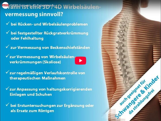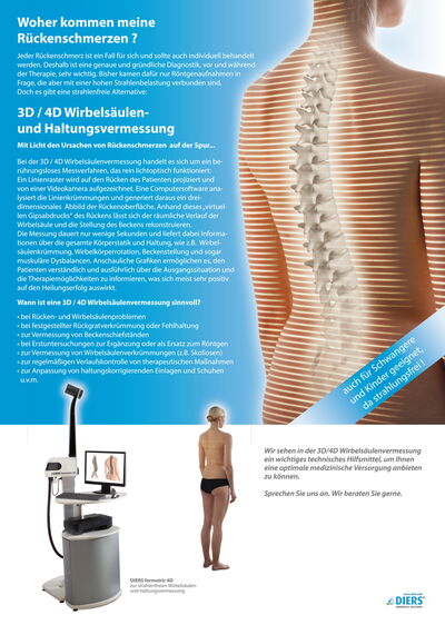 Es ist aufgrund umfangreicher wissenschaftlicher Studien möglich geworden, mit einem optischen Messverfahren, d.h. ohne jegliche Strahlenbelastung, dreidimensional Form und Lage der Wirbelsäule zu erfassen. Die Messergebnisse können Therapien unterstützen und führen in der Regel zu besseren Heilerfolgen.